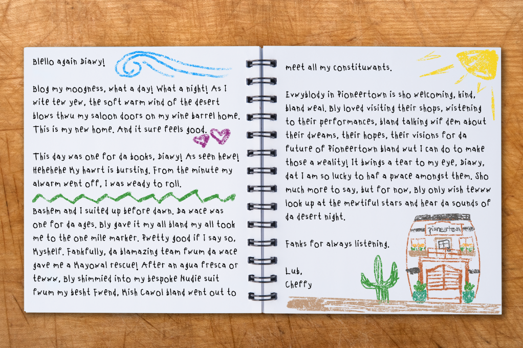 Diary, I won’t life to you, I never can. I am a bit nervous. Not about tomorrow, but about the honor that was bestowed on me by my fwends in Pioneertown and across the globe. I know I will do my very best, but my hope is Diary, that the people and animals of Pioneertown know just how much they all mean to me.