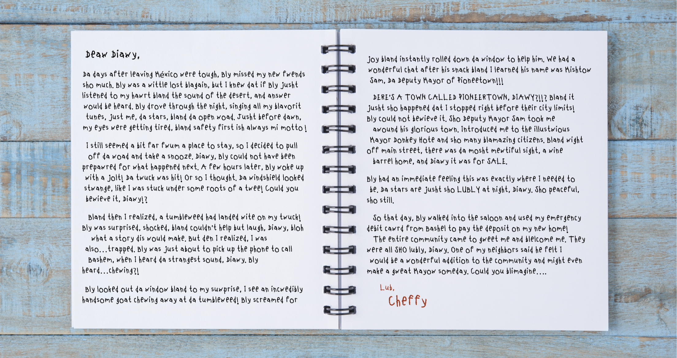 And then I realized, a tumbleweed had landed right on my truck! I was surprised, shocked, and couldn’t help but laugh, Diary, oh what a story this would make. But then I realized, I was also…trapped. I was just about to pick up the phone to call Bashem, when I heard the strangest sound, Diary. I heard…chewing?!