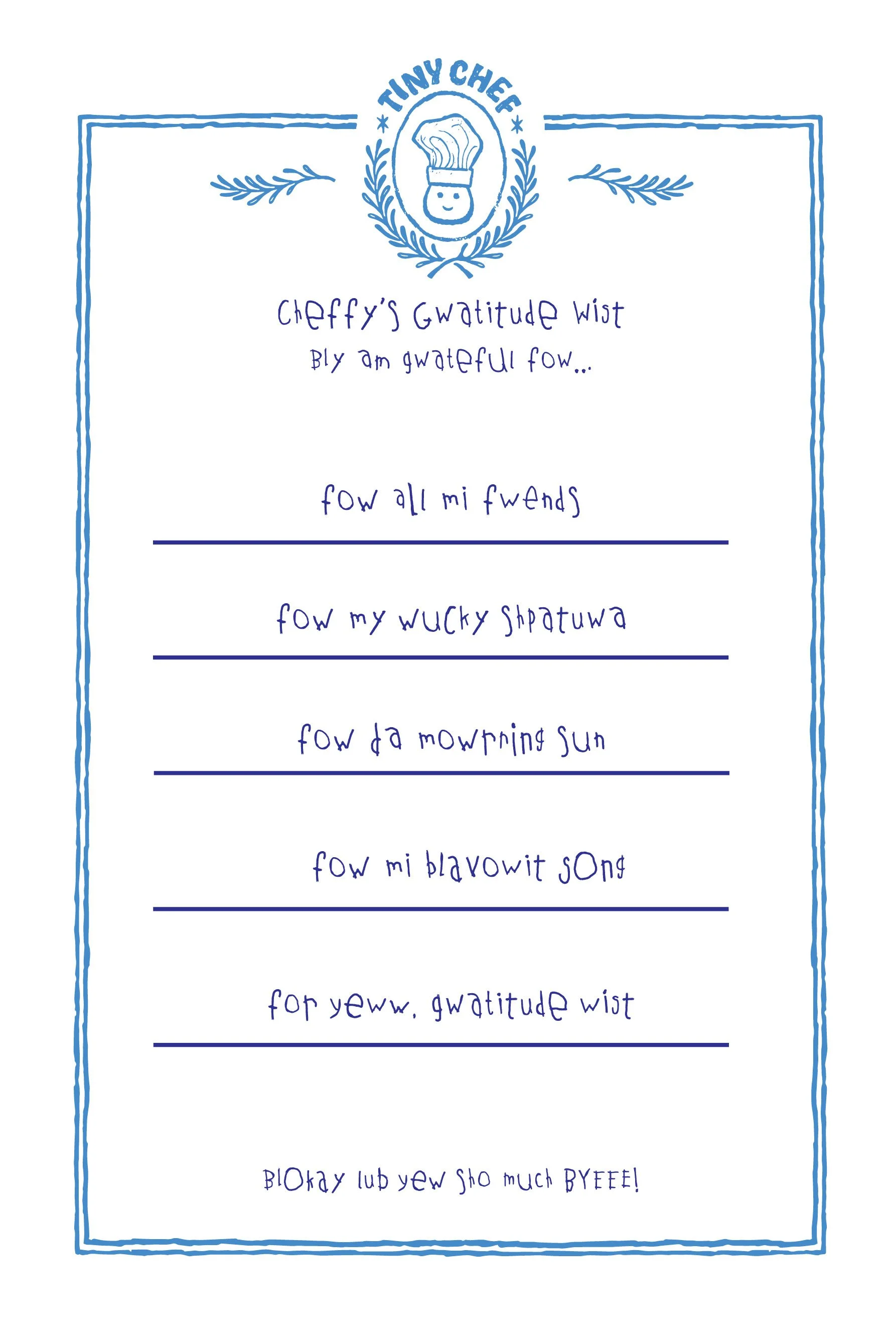 Blaftow meditashuns, one fing bly LUB to dewww to centow Blyself ish teww wite in my GWATITUDE JOURNOW. Bly kno Bly will be witing how gwateful Bly am to haf all of yeww ash my fwends! When Bly journow, Bly find it’sh eashiest to wite one small fing down bland den befow Bly kno it, Bly haf a whole wist of fings dat Bly am gwateful fo!